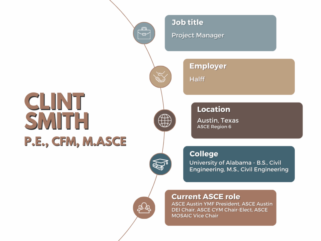 As a member of MOSAIC, he created the Code of Conduct for ASCE events and continually strives to ensure that all members’ voices are heard and represented. And with CYM, he views his role as to create programming for Younger Members to learn from and use to help grow into a career that they love.